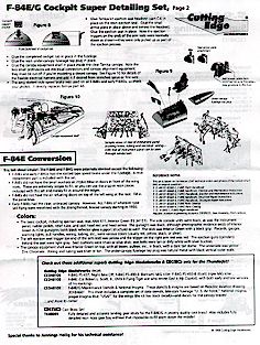 Cutting Edge F-84E/G Cockpit Super Detail Set This set supplies twenty resin replacement parts for Tamiya's Thunderjet cockpit and fuselage. Four of the parts, the seat, rudder pedals and the tub, are moulded in a medium grey resin (a new, tougher formula) and the remainder in a more familiar creamy yellow. There are no pinholes or flaws on any of the parts.