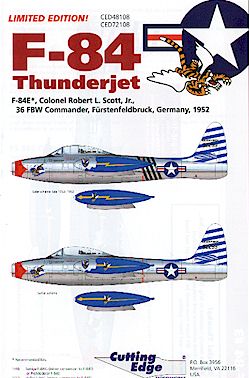 One of the aircraft features pinup artwork. A second set of pinup artwork is supplied just in case references surface showing the picture on the port side of the aircraft! CED 48108 is a German based USAF bird with a blue and white striped tail. Two schemes for the same aircraft are supplied. In addition to the tail markings, the subject aircraft features various flying tigers and Command stripes. As an F-84E, this one takes advantage of the abovementioned Cutting Edge conversion. The pilot of this aircraft, Brigadier General Robert L. Scott Jr., USAF retired, assisted in the production of this set. Finally, CED 48109 supplies all the remaining markings required for a truly complete Thunderjet. Markings include stars and bars, large USAF stencils (correctly depicted in Blue), canopy framing and stencils right down to the tiniest detailed lettering. Even the smallest stencils are sharp and readable under a powerful magnifying glass. The technical drawings include not only stencil placement information, but also instructions on correcting kit panel lines and pointing out areas of the aircraft that were painted with aluminium lacquer! Registration on my samples were perfect in all cases. Buzz numbers and large "USAF" markings have been thoughtfully printed separately to minimise excess carrier film. Templates are supplied to assist accurate alignment and spacing.